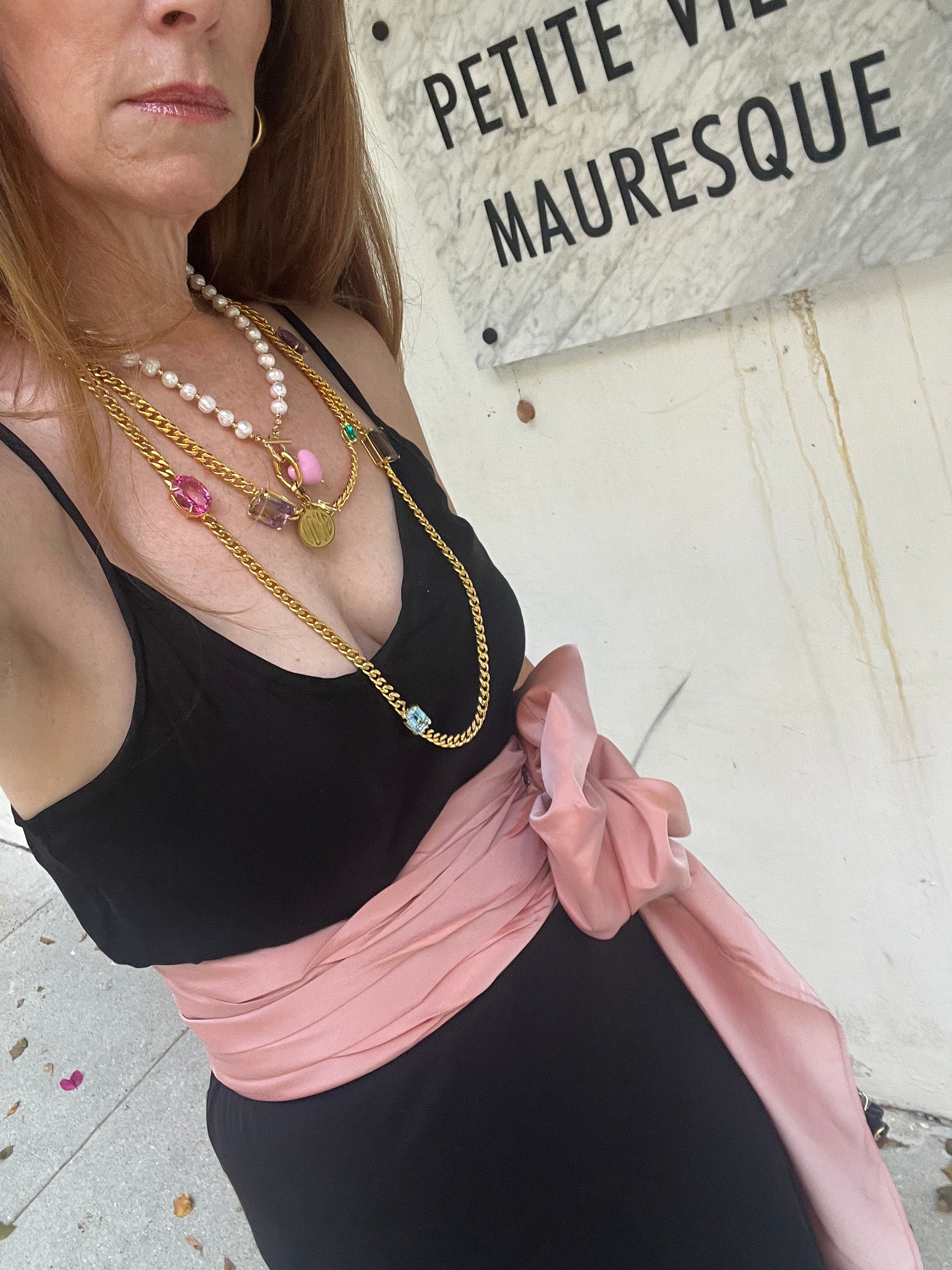 Watch out because there are 3 cocktail ring worthy stones sprinkled in this necklace- a beautiful purple pear shaped amethyst, a lavender/ yellow amethyst and a bright green emerald heart. A total showstopper on its own with a T-shirt or a chic suit. It’s versatile and SO fun. 18k gold vermeil, lab grown emerald & authentic amethysts- gorg!