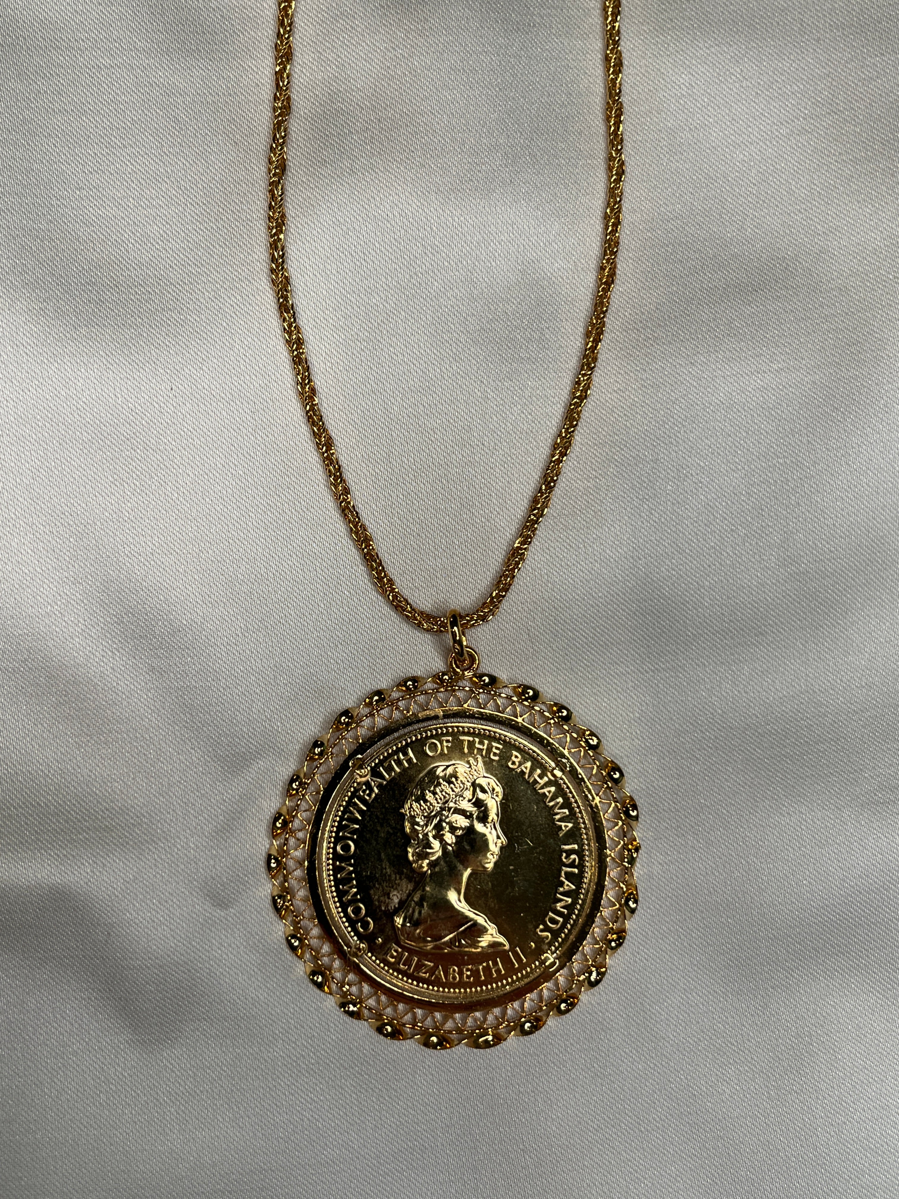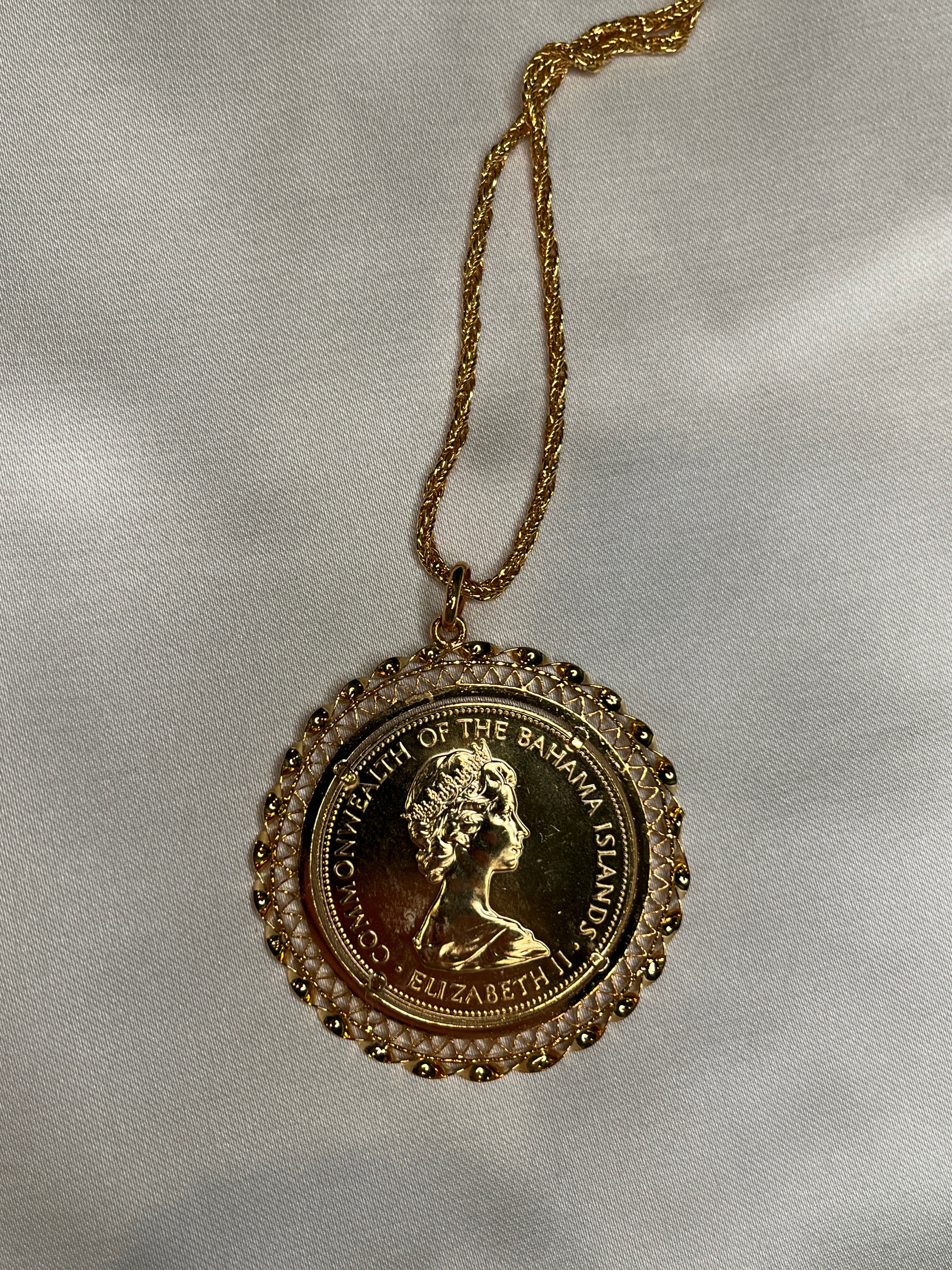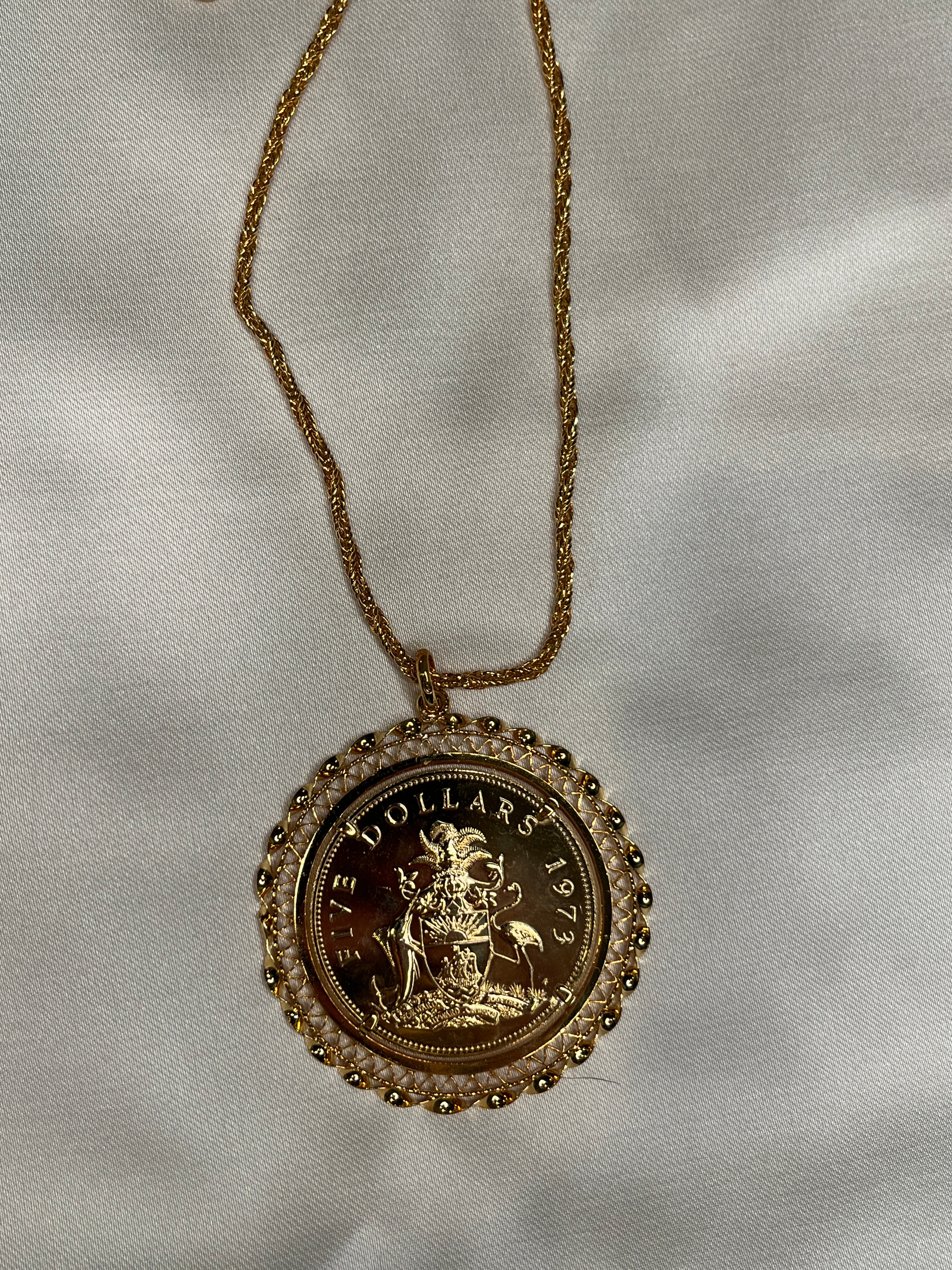 Five Dollar 1973 Bahama Coin made into a necklace and made 18k gold by us. No words for how rad this is, if you have the mojo to wear it!