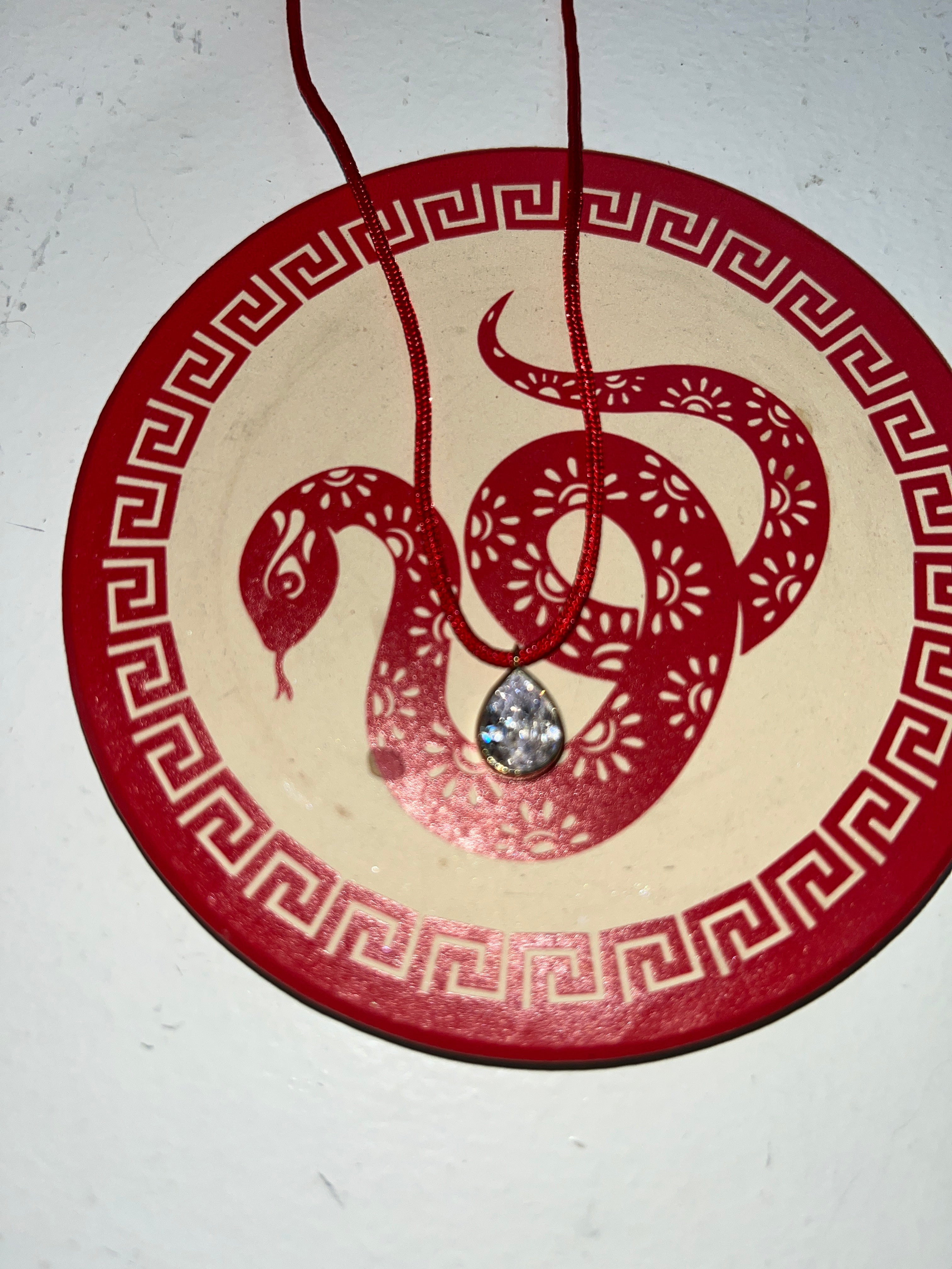 Red Cord with a super sparkly pear shaped diamonte. It is sparkle and sport all in one. Just the way we like it so we can always keep it on.