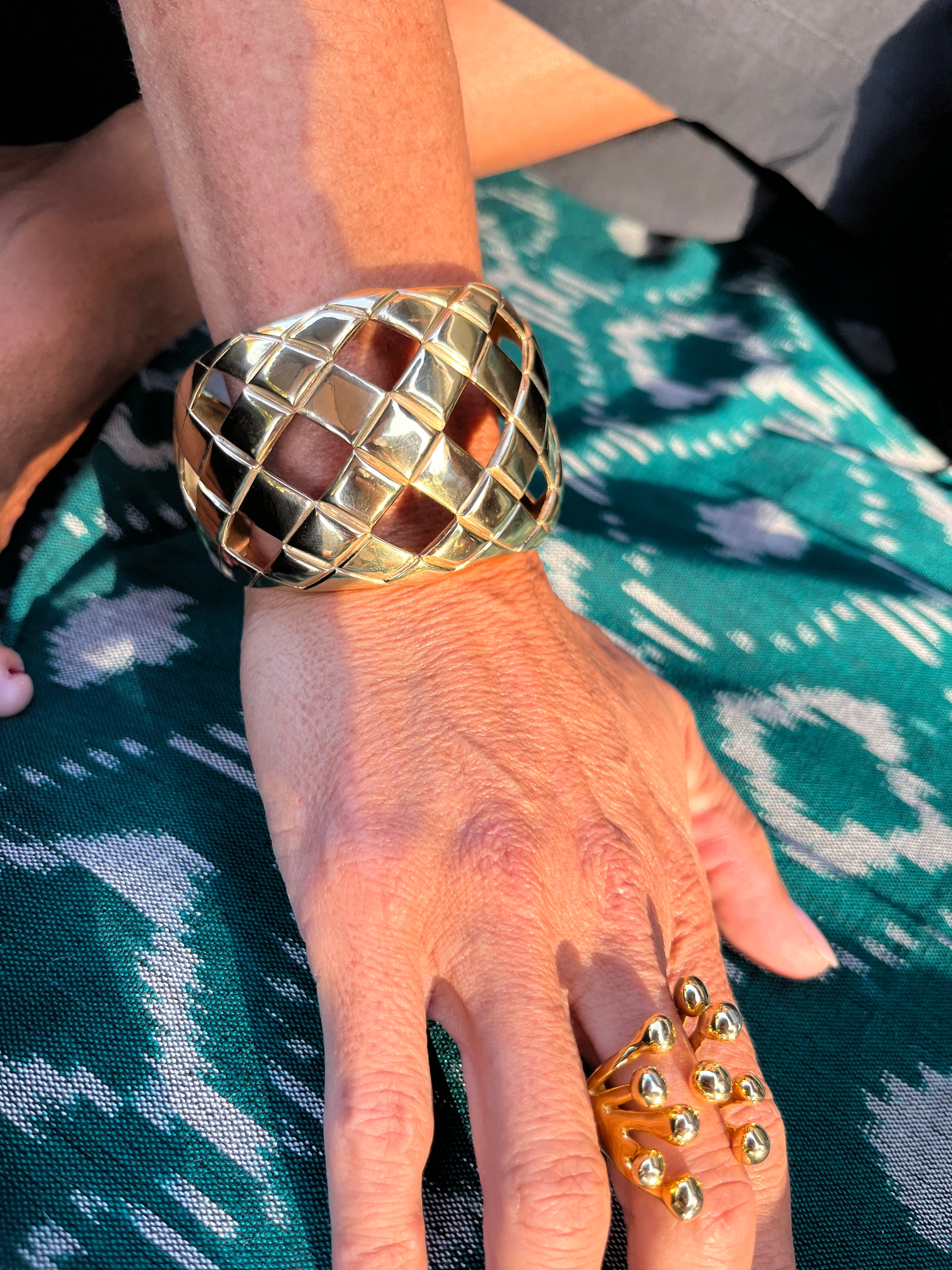18k vermeil on top of brass gives a great weight to this piece. And the vermeil is top quality so it will last through through whatever you put it through.
